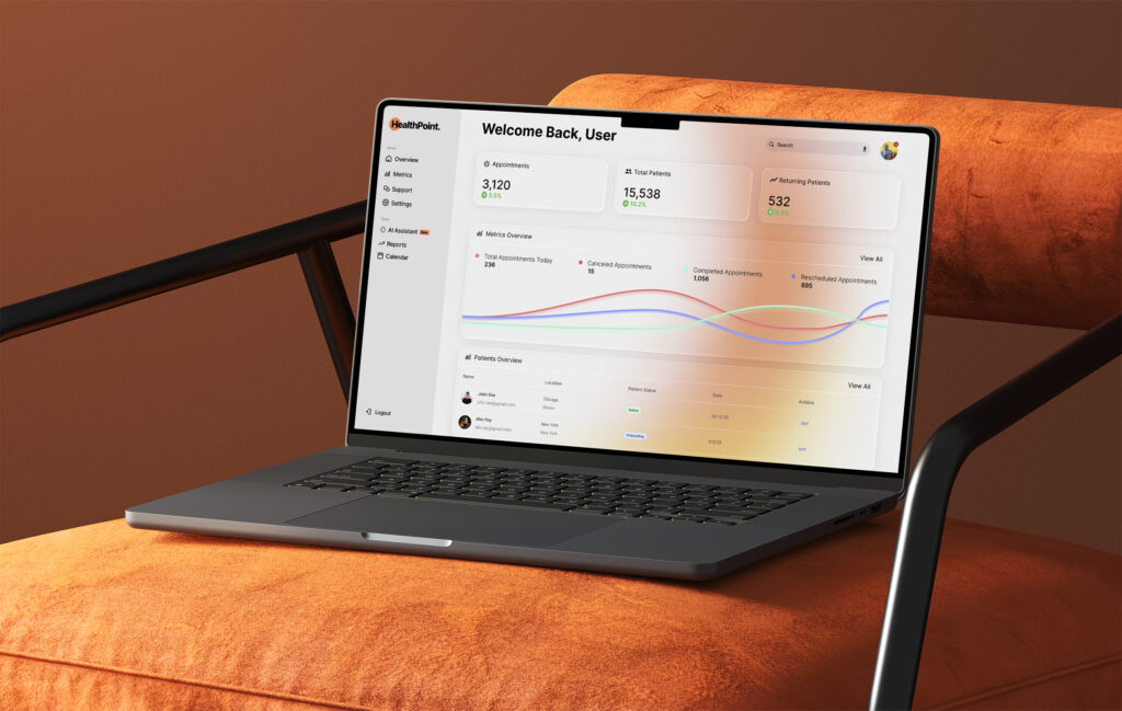 A healthcare dashboard concept designed to present key appointment metrics at a glance. The interface highlights daily totals, cancellations, completions, and rescheduled visits, supported by a clear trend graph and a streamlined patient overview table. The layout focuses on readability, quick scanning, and a modern clinical feel suitable for providers and administrative teams.
