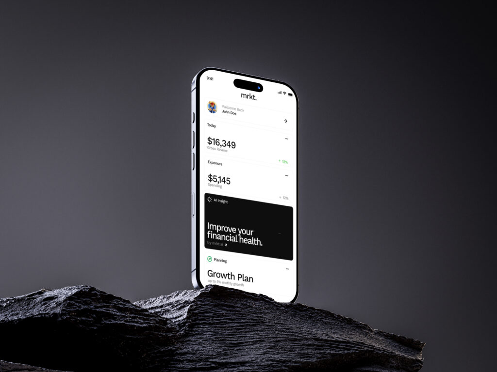 A mobile finance dashboard concept that surfaces daily revenue, spending, and quick performance insights in a minimal, high-contrast layout. The design focuses on clarity and fast readability, with AI-driven suggestions and planning tools integrated into a streamlined experience for on-the-go users.